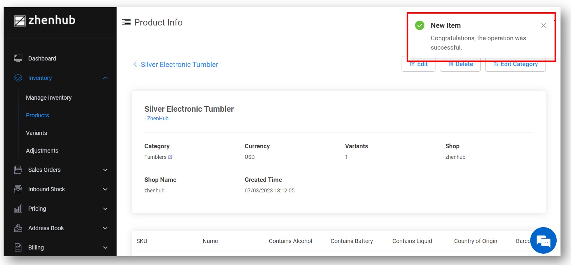 8. A pop-up message will appear to confirm successful product creation.